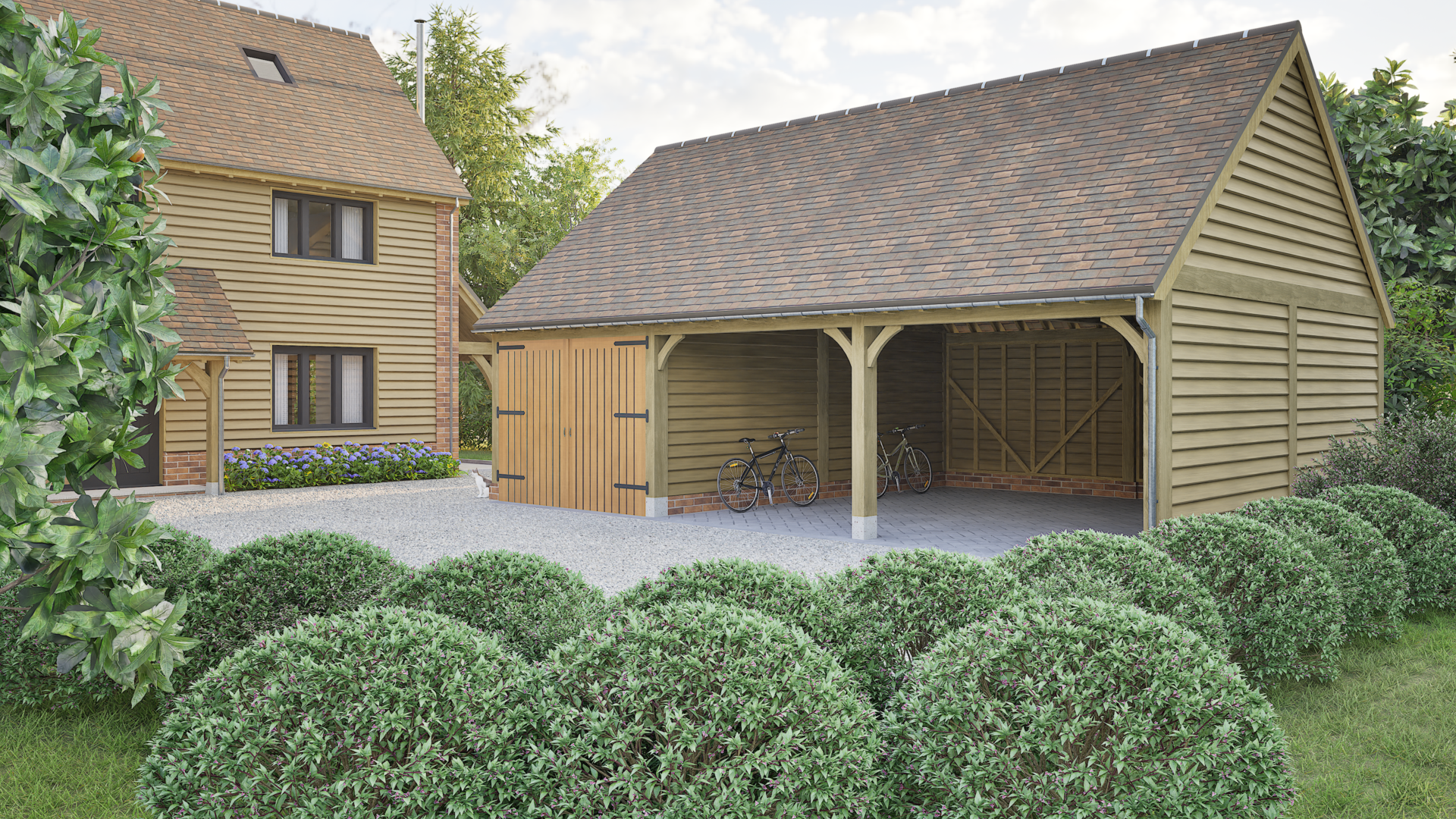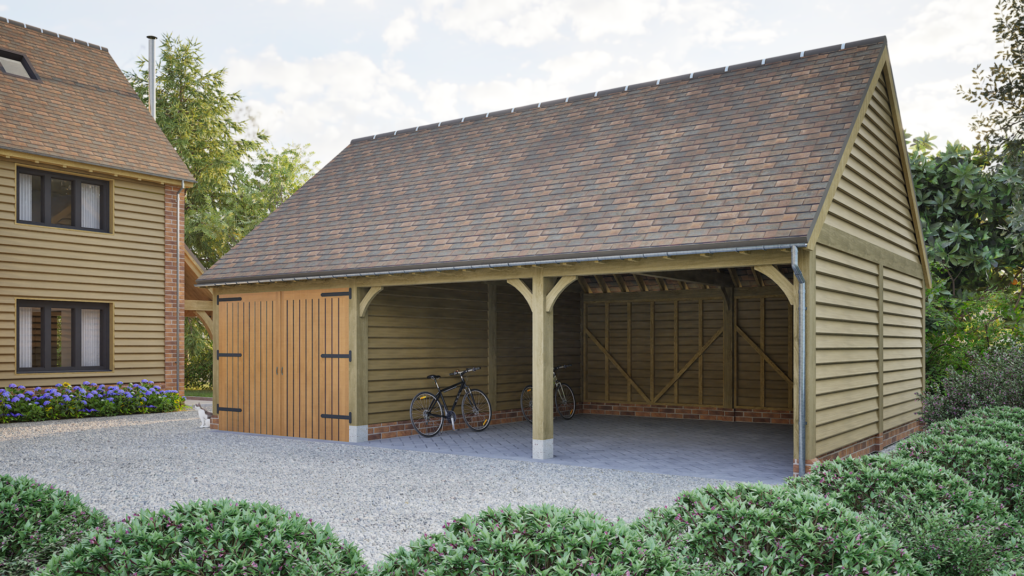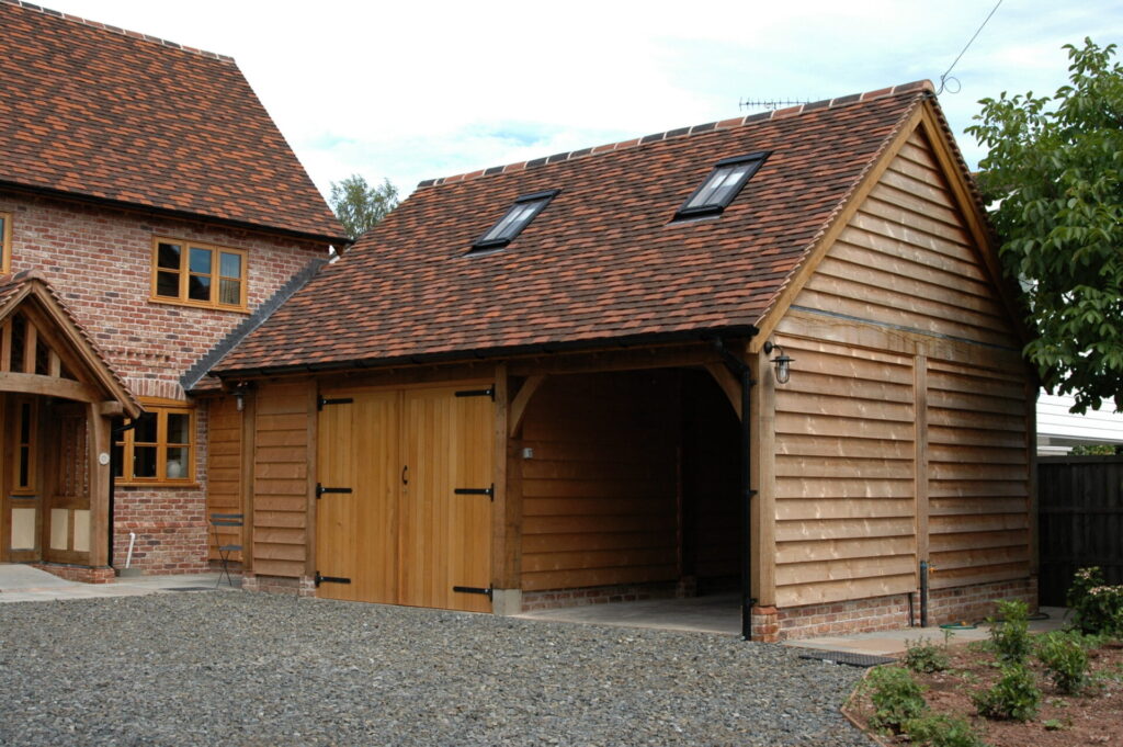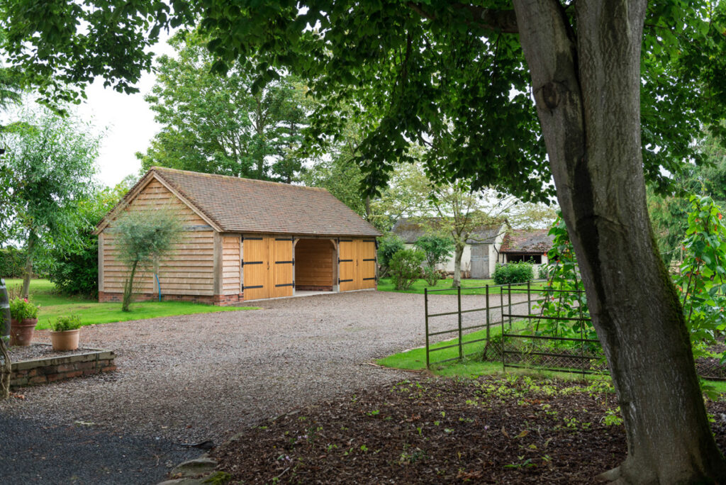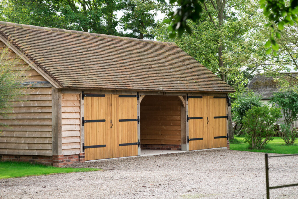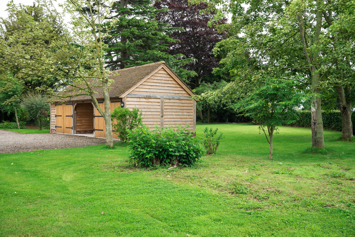 A single storey outbuilding, but with a larger roof space and full height eaves to the front and rear. Works well in multiple bay lengths and can have either a full pitched roof or hipped ends. A building with classical proportions that provides a handsome addition and with many practical uses beyond garaging. Also works well as a complex when added to other outbuildings.
