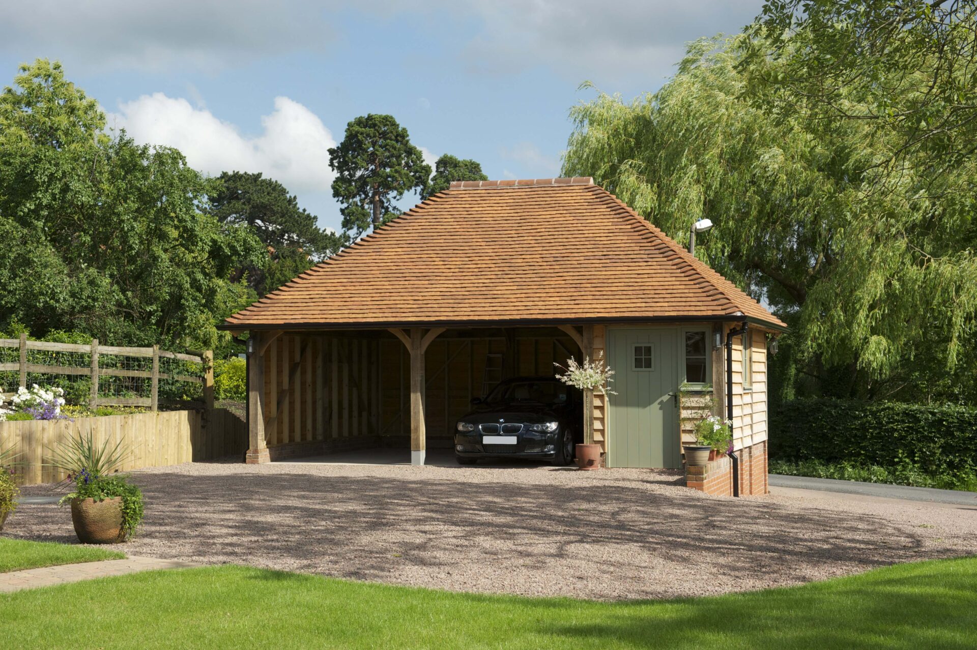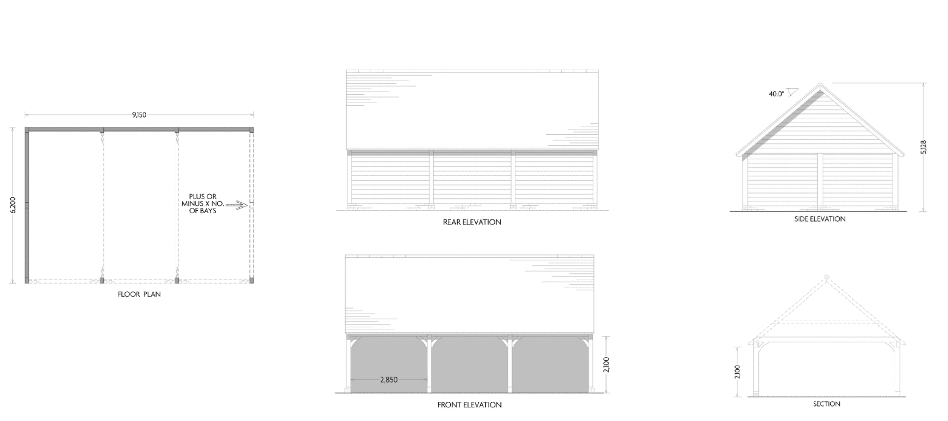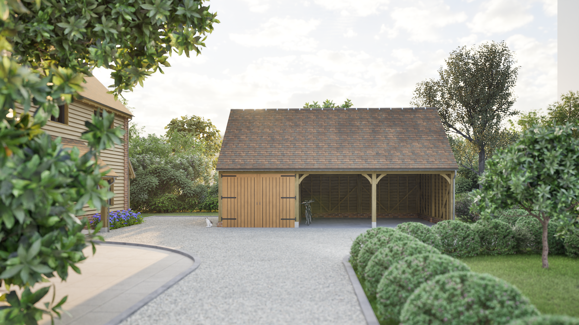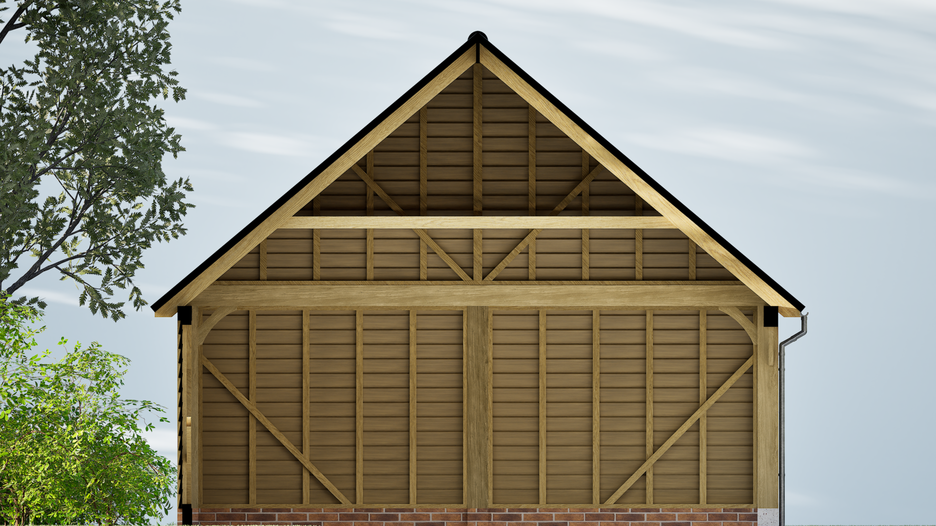 A single storey outbuilding, but with a larger roof space and full height eaves to the front and rear. Works well in multiple bay lengths and can have either a full pitched roof or hipped ends. A building with classical proportions that provides a handsome addition and with many practical uses beyond garaging. Also works well as a complex when added to other outbuildings.