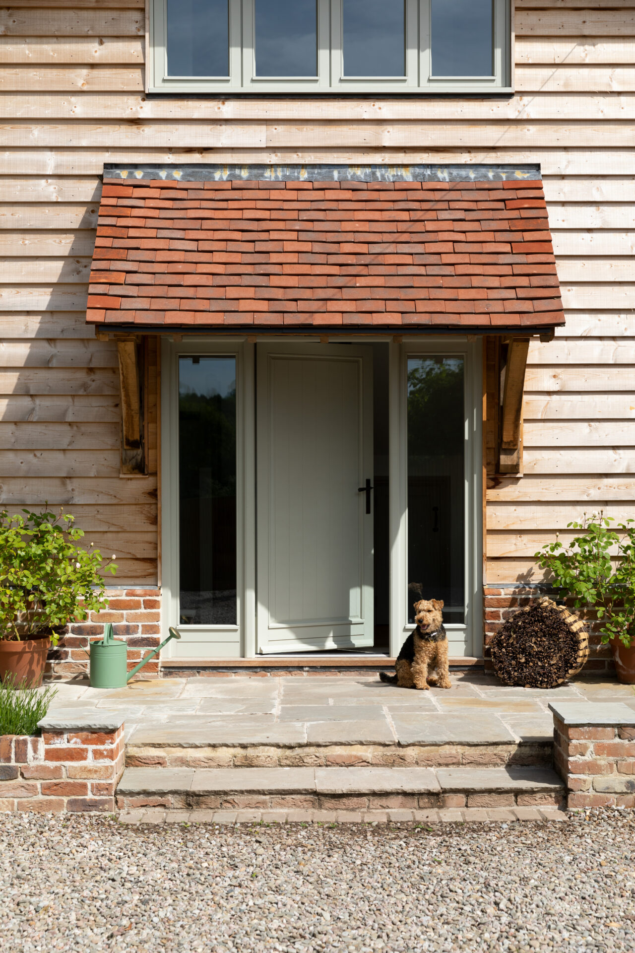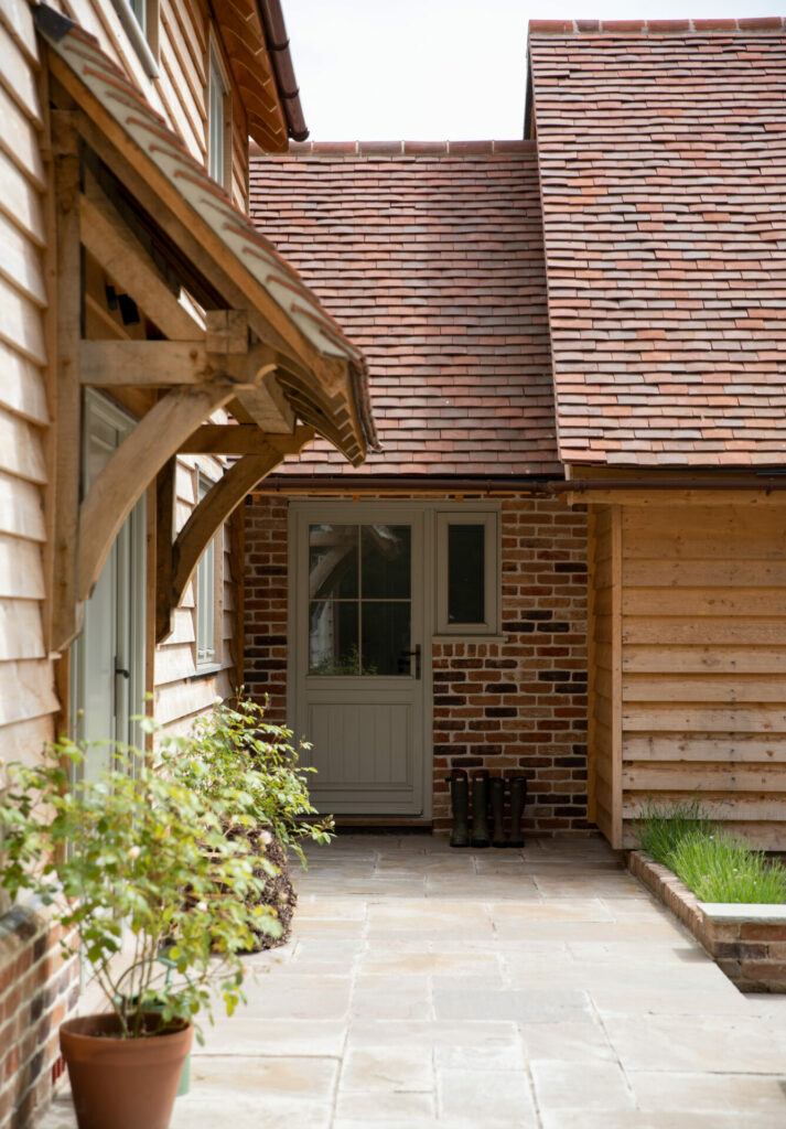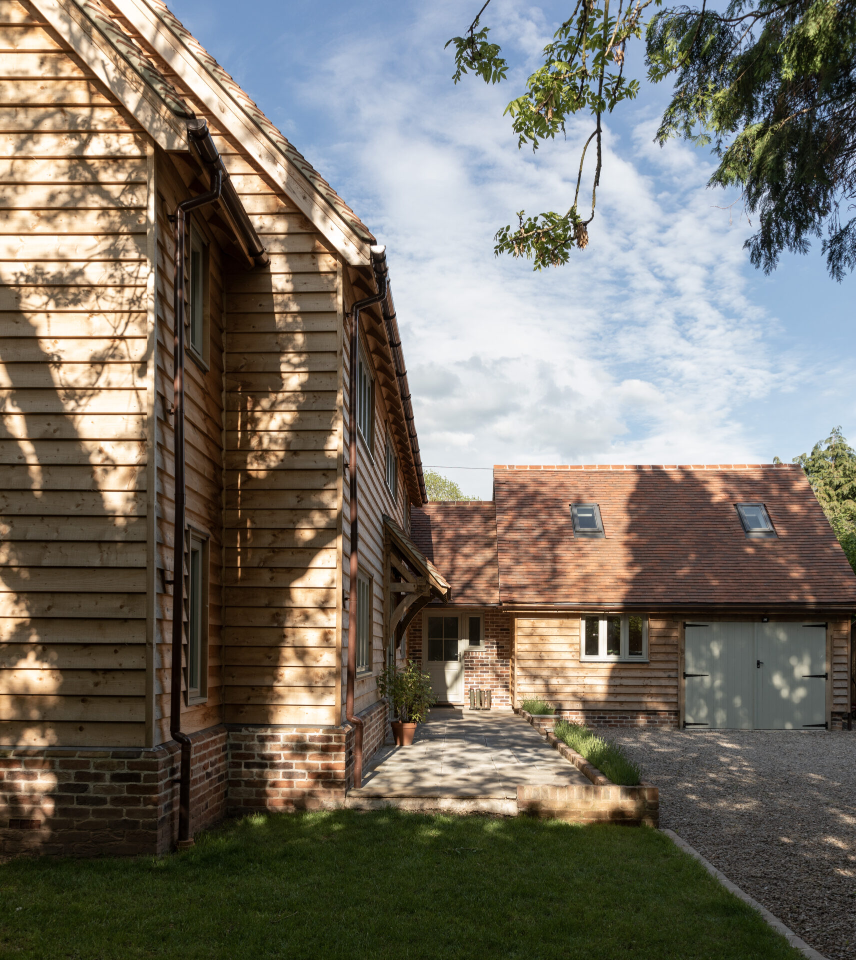 Externally, the natural weatherboarding and handmade bricks are already weathering softly, helping the barn settle into its private plot, tucked away from the village lane, yet elevated to capture long views over neighbouring pastures.