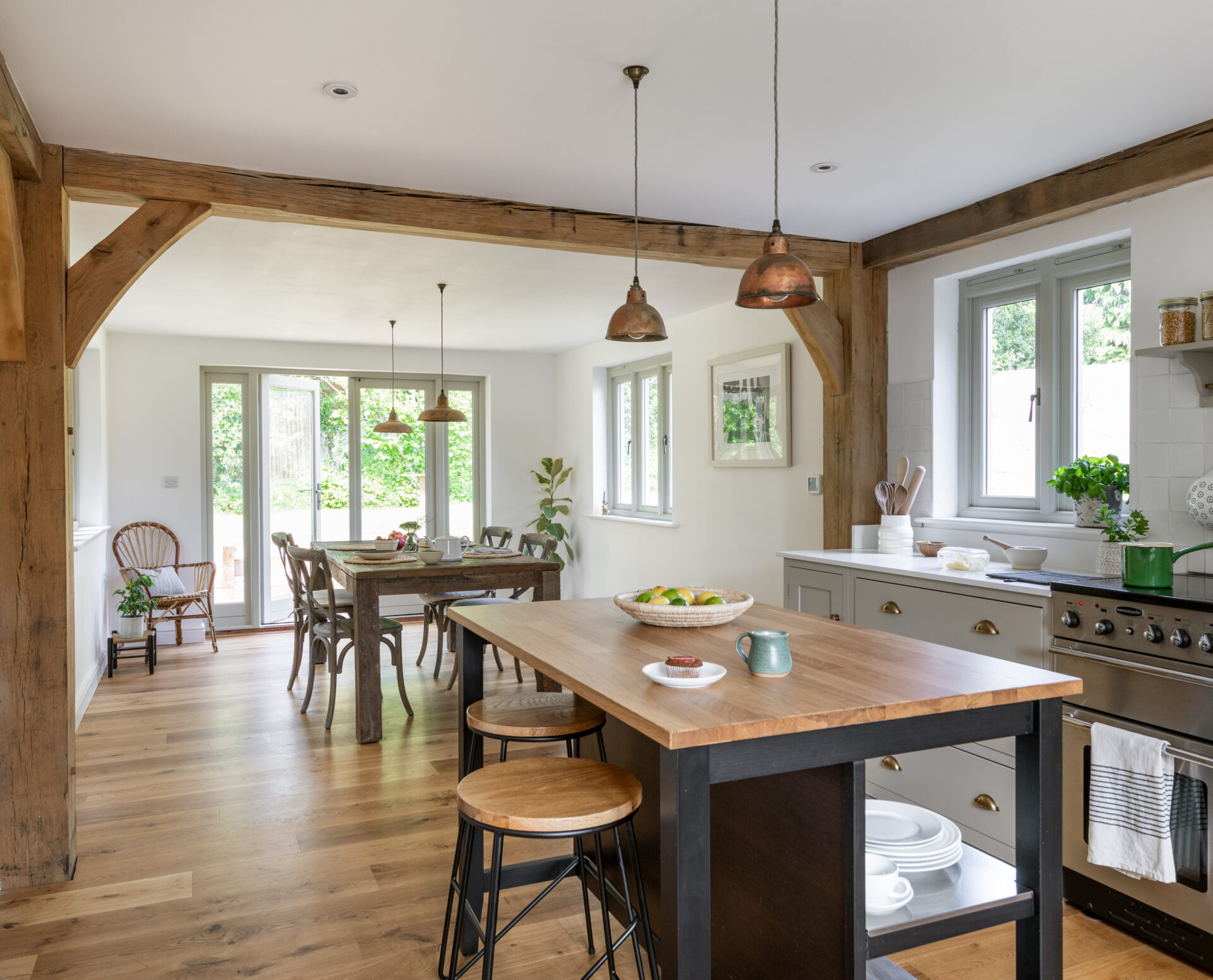 With a ‘broken plan’ (a bit like open plan, but with some pockets of privacy) ground floor layout and three generous bedrooms upstairs, the planning approval Border Oak had already secured was coincidentally very close to family’s requirements.