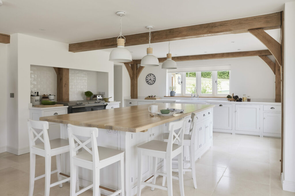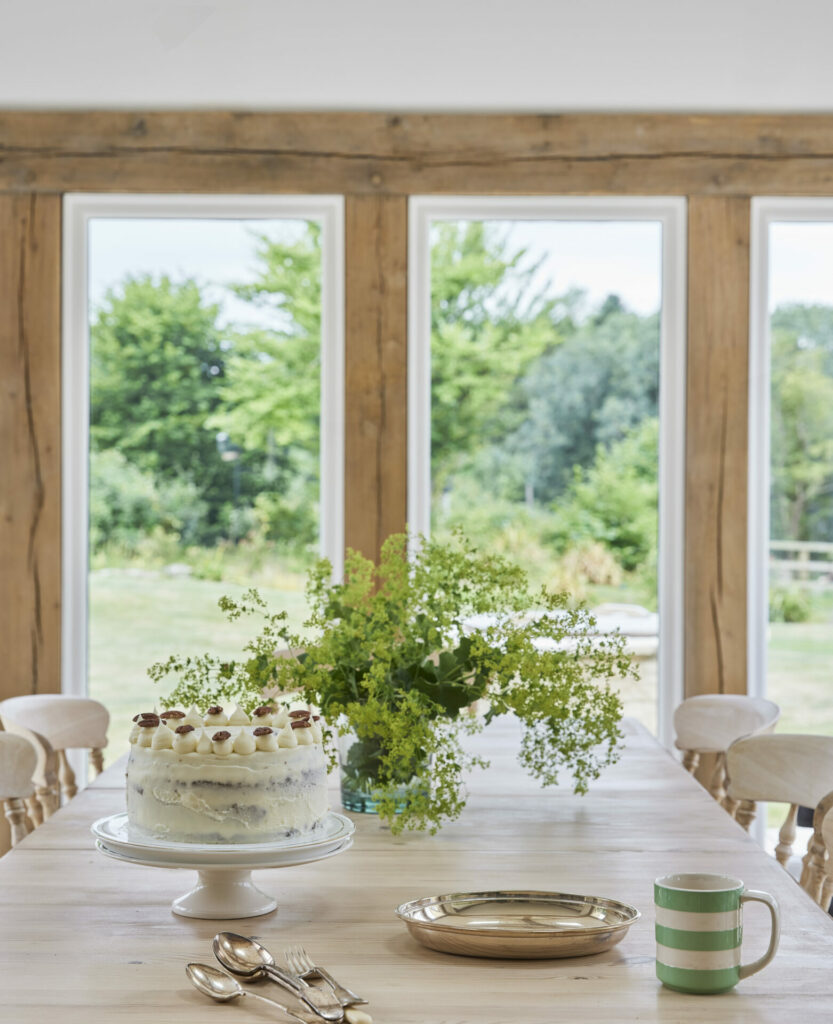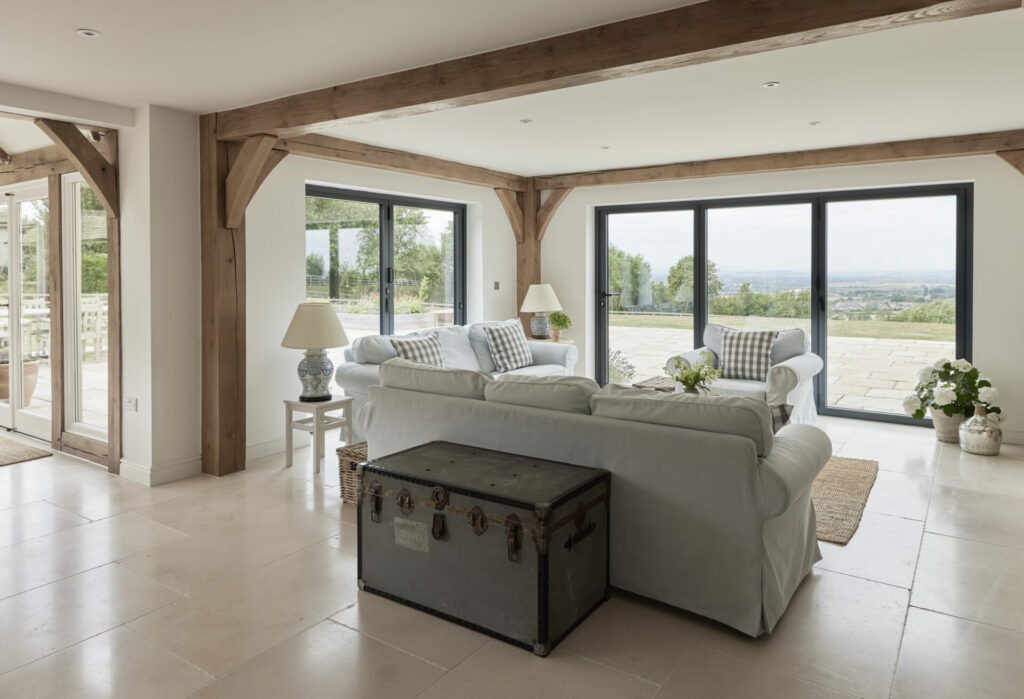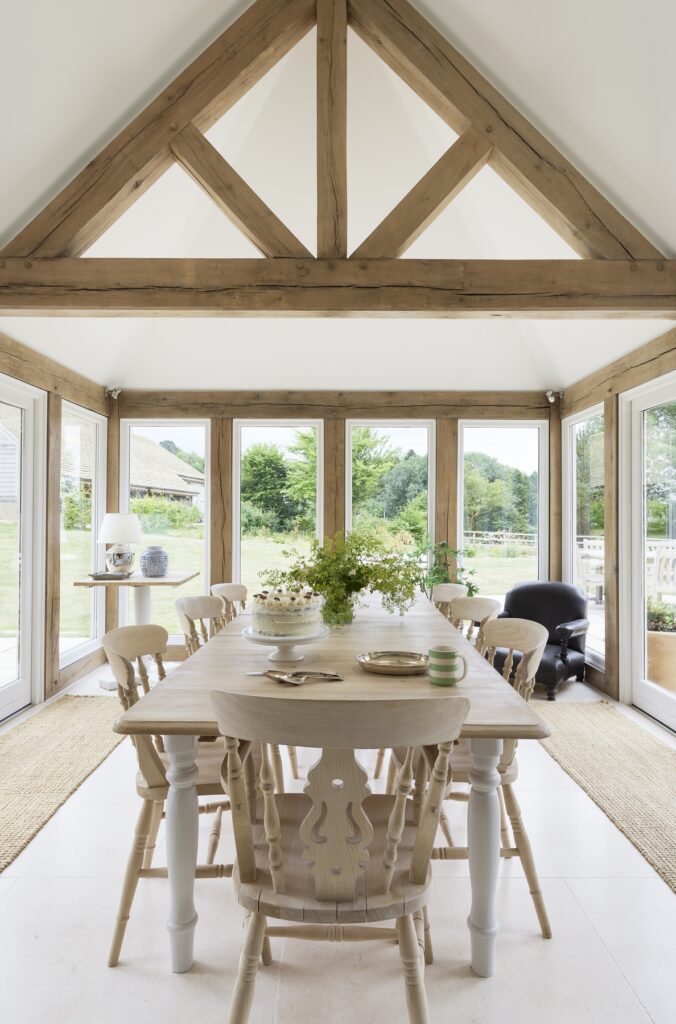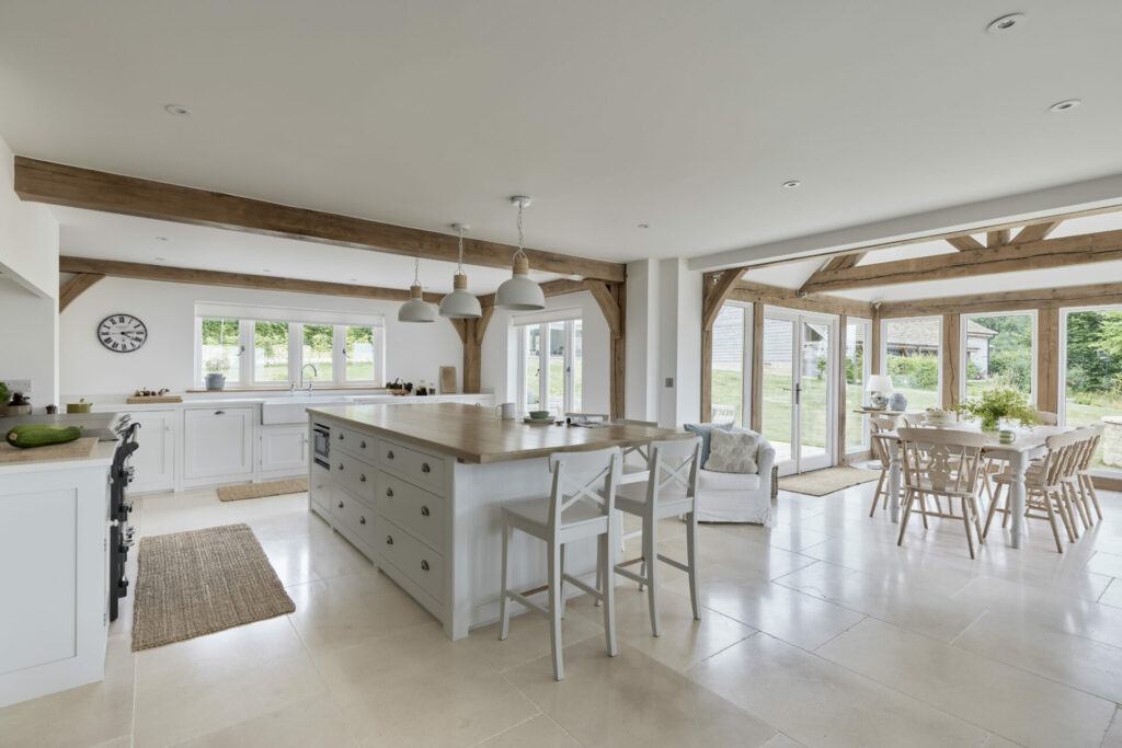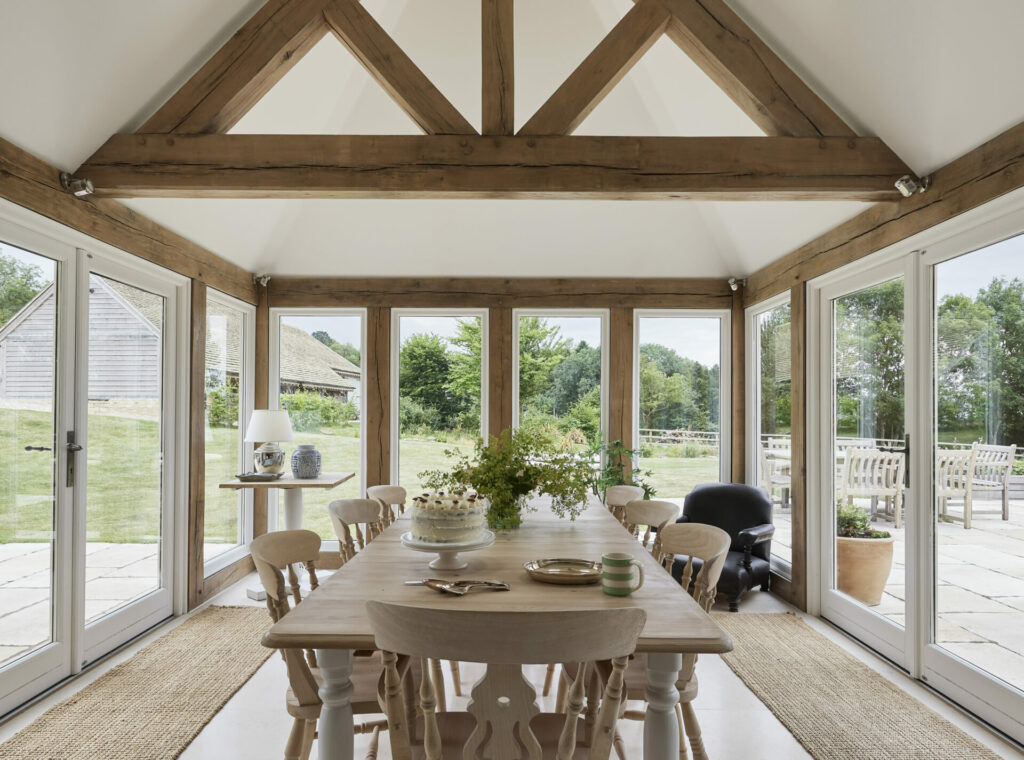 Border Oak also designed and built a range of beautiful outbuildings to complement the main property – a stand alone annex barn with extra accommodation, a cinema and music room, together with a smaller barn for entertaining and a large garage with log store, storage, apple room and cider press. You can see the outbuildings here Annexes & Cabins