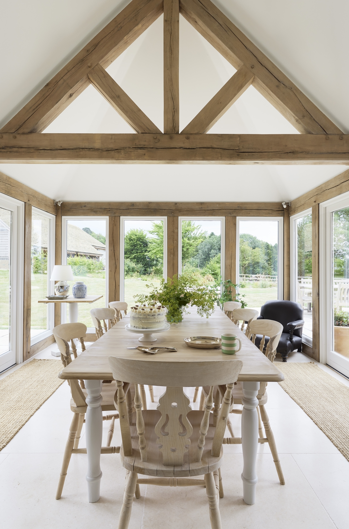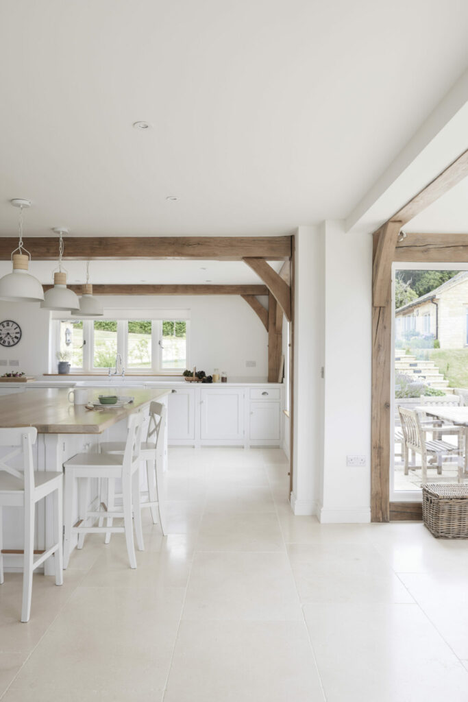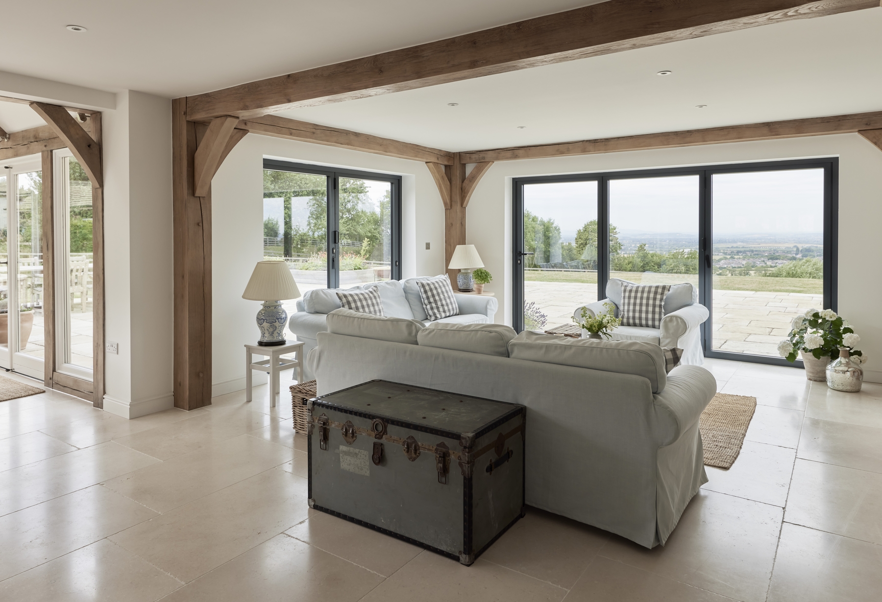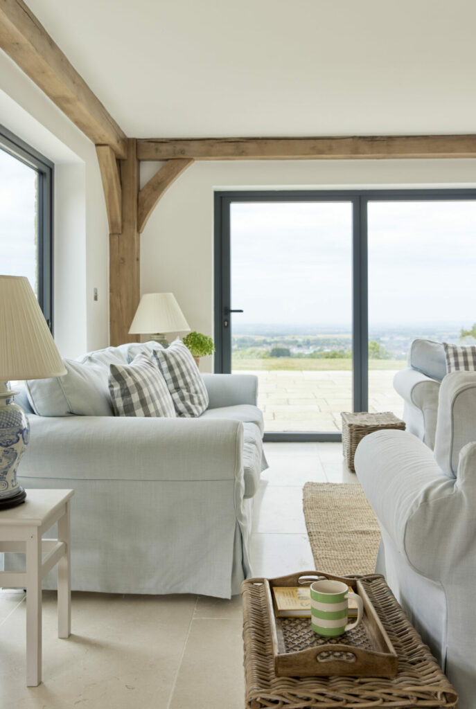Internally great attention has been paid to forming light, interlinked and flexible interior spaces that maximise the incredible setting. Most of the primary rooms look across the long distance views and ever changing scenery. The generous family kitchen is subtly zoned, with a beautiful vaulted oak framed garden room to one side.