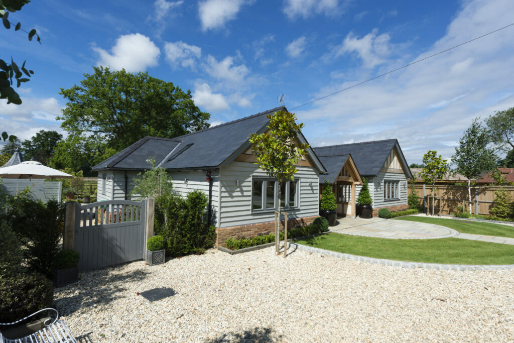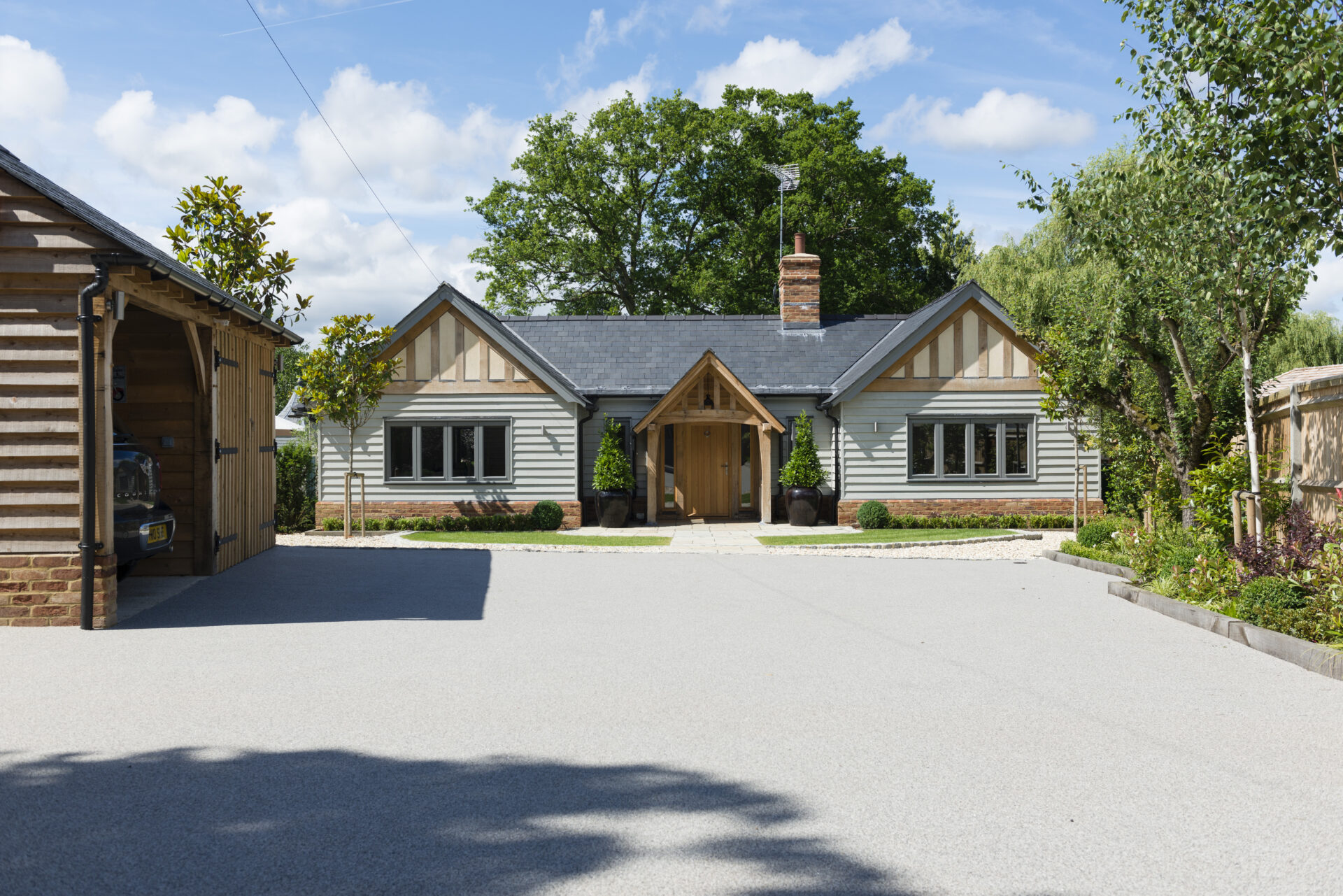 The site was originally occupied by an older cottage and sat on a leafy Surrey lane, overlooking meadows and long country views. The owners had lived in the village for a long time and purchased additional land to stitch together a wonderful plot in the perfect location hoping to build a two storey Border Oak barn. However planning restrictions meant that a single storey design was their only option.