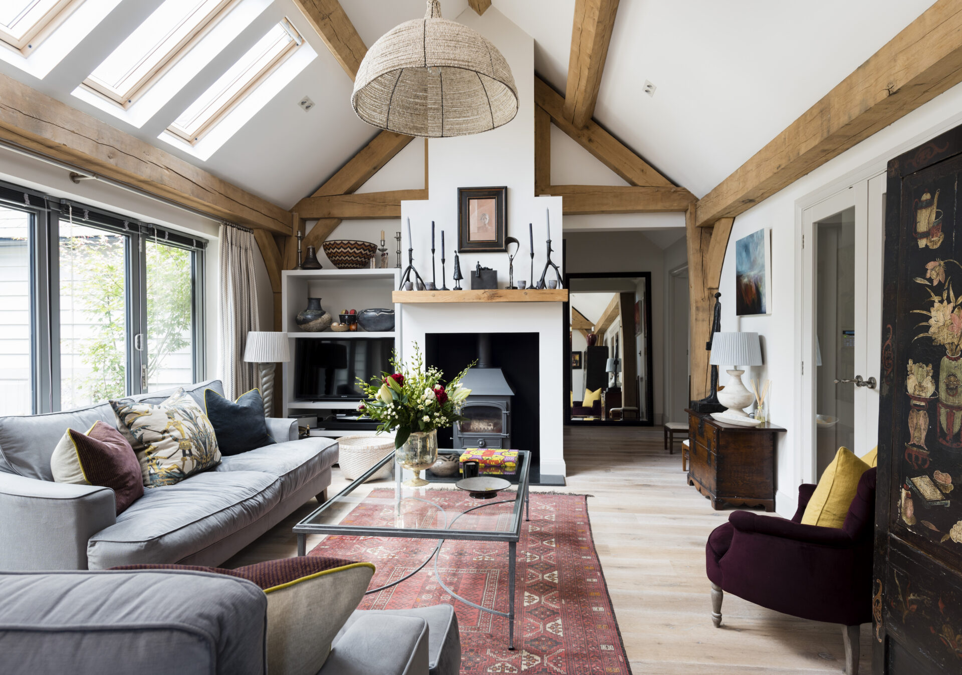 Externally, the building is predominantly clad in painted weatherboard over a deep brick plinth with a slate roof. Internally the oak frame provides architectural interest and continuity as the spaces flow from the more public to private and work perfectly as the back drop to our clients wonderful collection of artefacts and furniture.