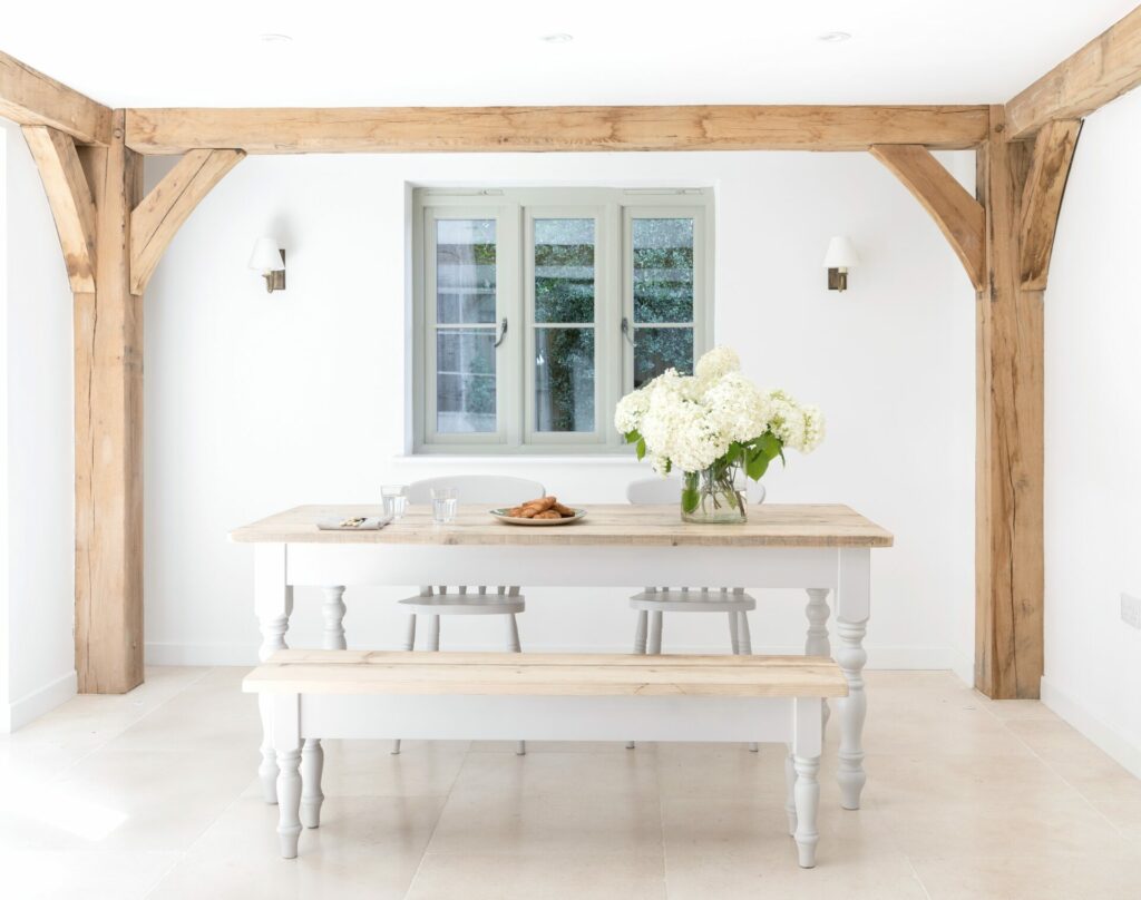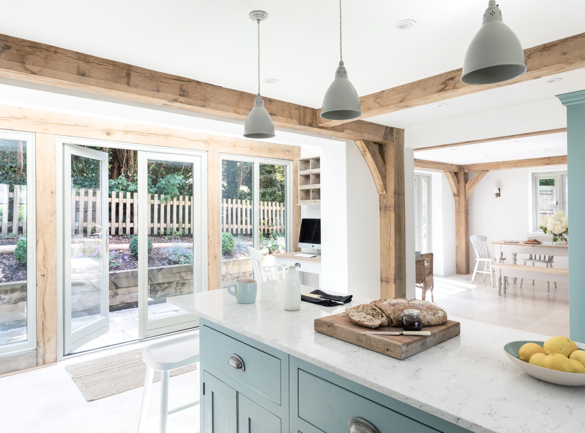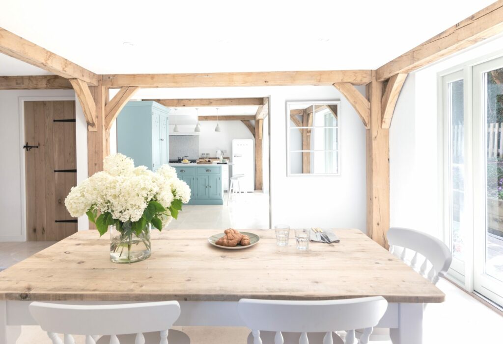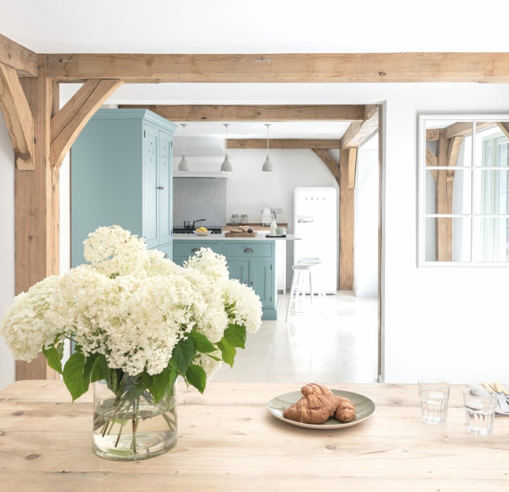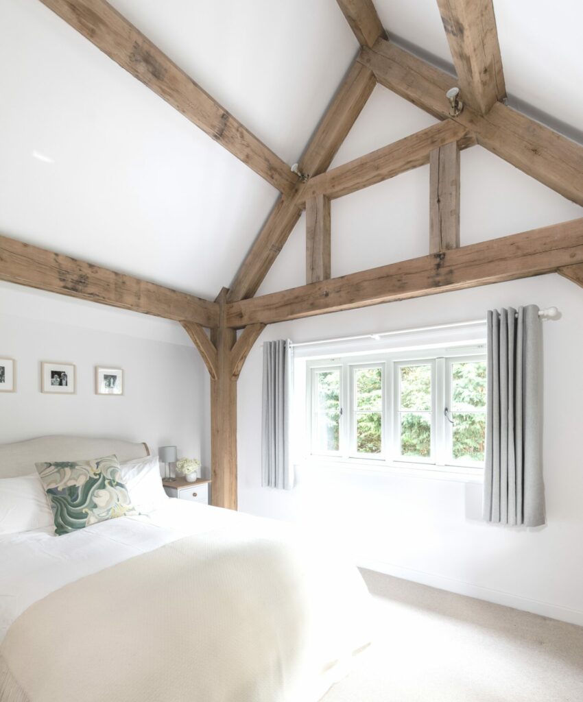 Internally the house is beautifully finished with a modern and timeless approach using a considered palette of light and neutral tones, punctuated with moments of colour but always allowing the oak frame to shine.