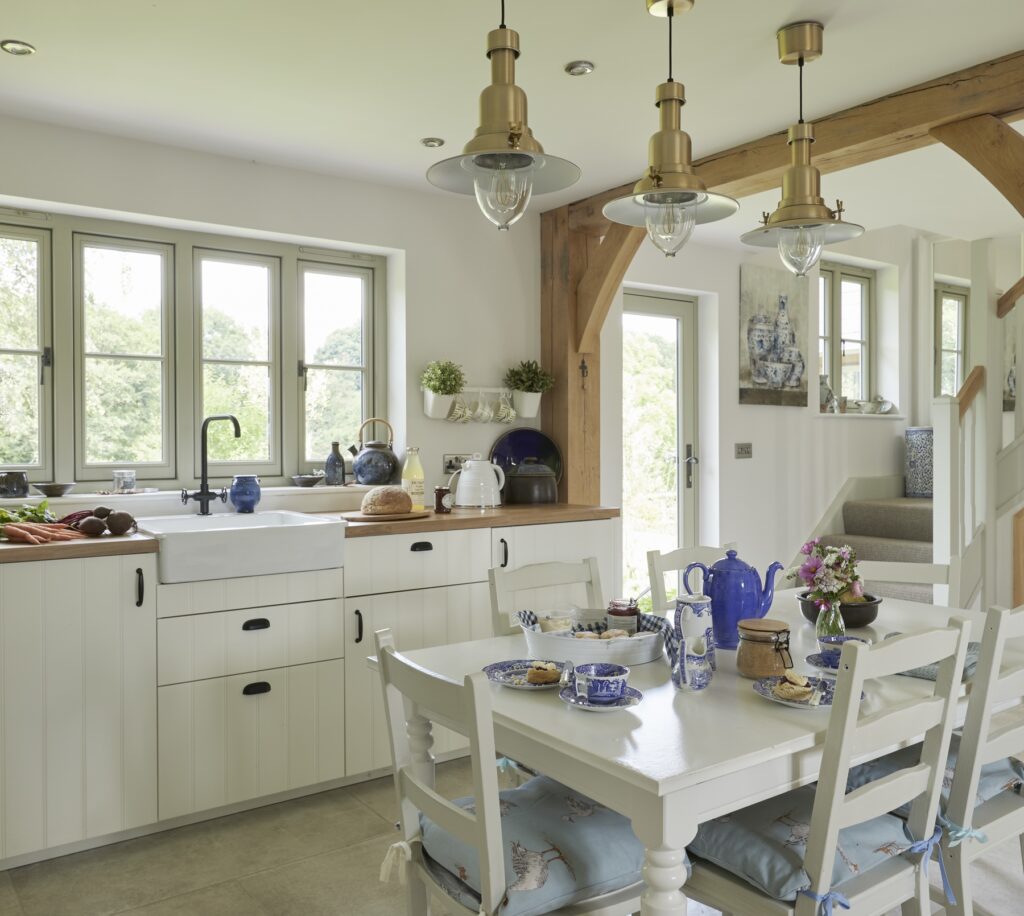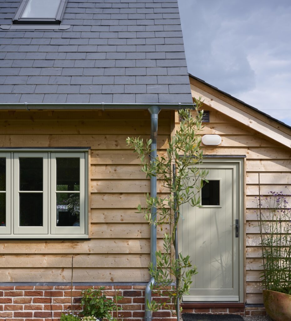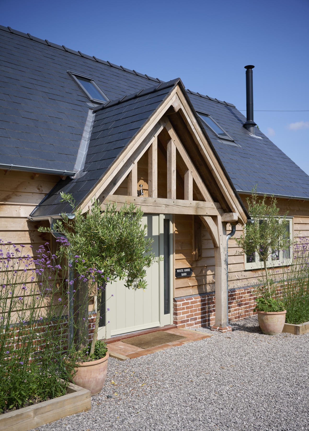 Constructed using our special encapsulation system (internal oak frame & SIPs) White Goose Barn is faced in natural weatherboarding over a handmade brick plinth, under a slate roof. It is super insulated and heated by an air source heat pump. The large oak frame porch not only warmly welcomes visitors but provides spaces for wellies or logs. The barn is surrounded by pretty and simple native planting specifically designed to provide habitats for bees and butterflies.