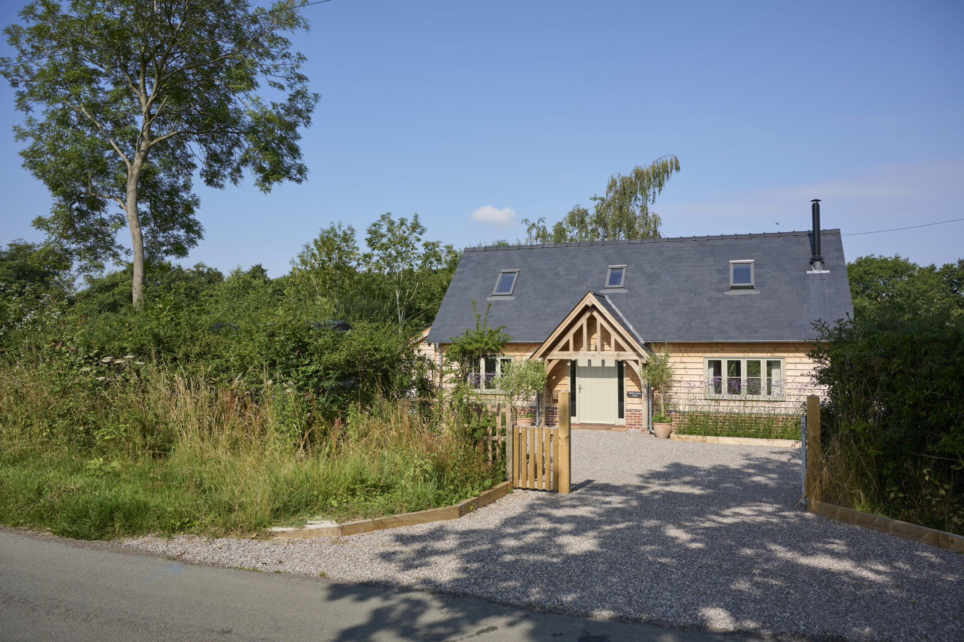 Utilising Shropshire Council’s forward thinking ‘Affordable Self & Custom Build’ policies Border Oak worked closely with our wonderful client to design & build a modest barn in the garden of her previous family home. This enabled our client to remain living locally and free up her larger home for another family. It was a unique opportunity to create a house that perfectly suited her needs and was warm, low maintenance, super efficient and bright.