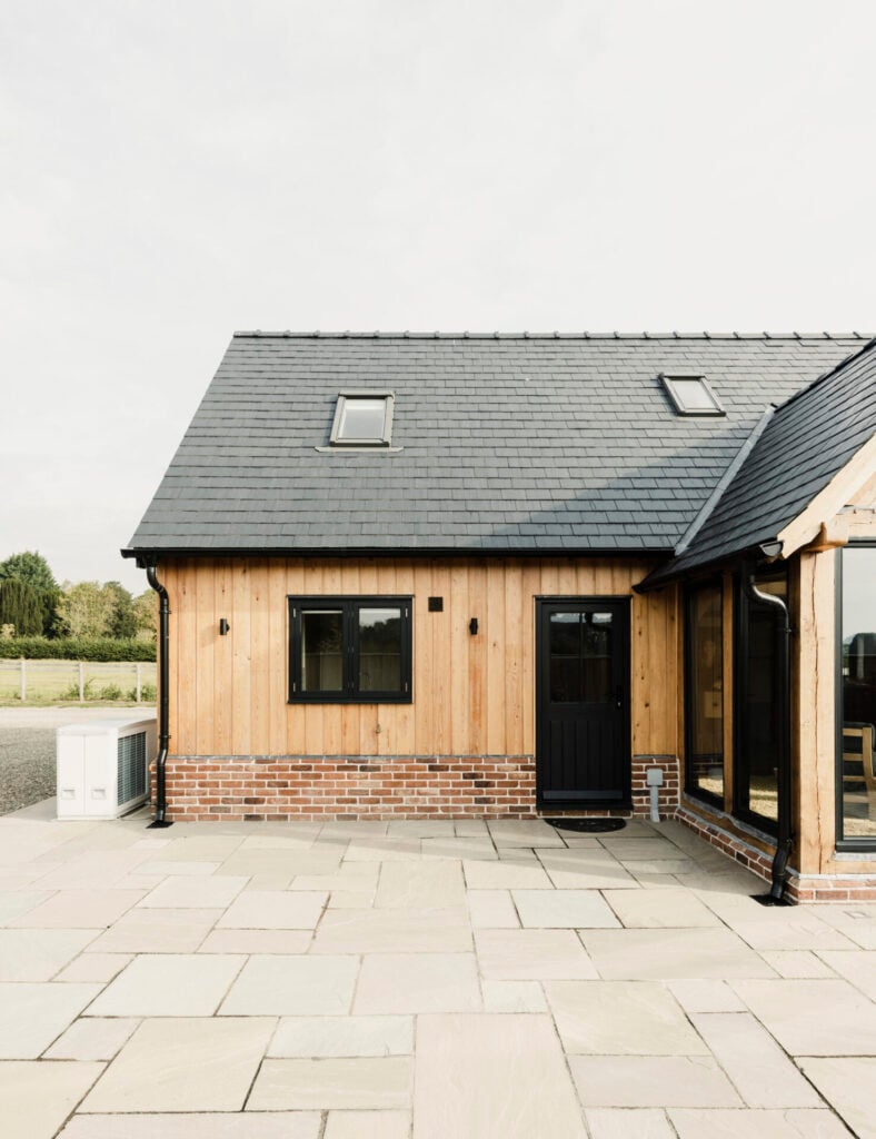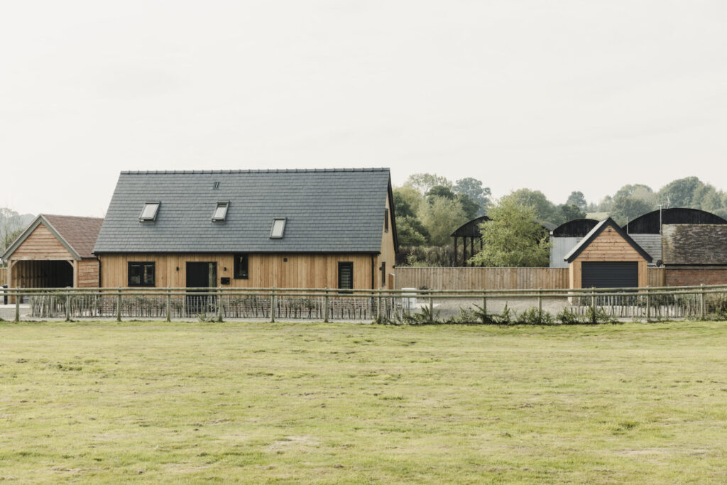 A modest and contemporary oak framed barn (part of a larger custom and self build collective scheme of 9 Border Oak homes delivered in partnership between Border Oak and the landowner) in a rural village on the Herefordshire and Shropshire border.