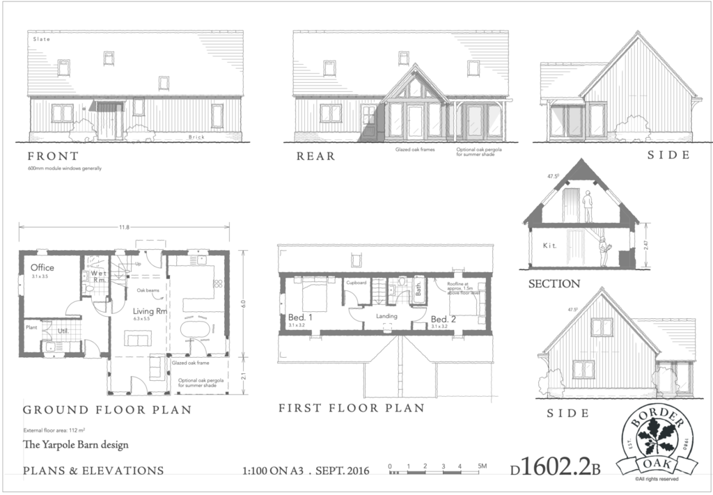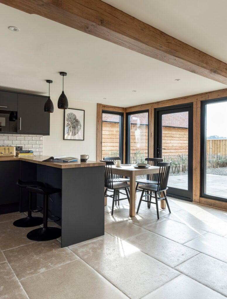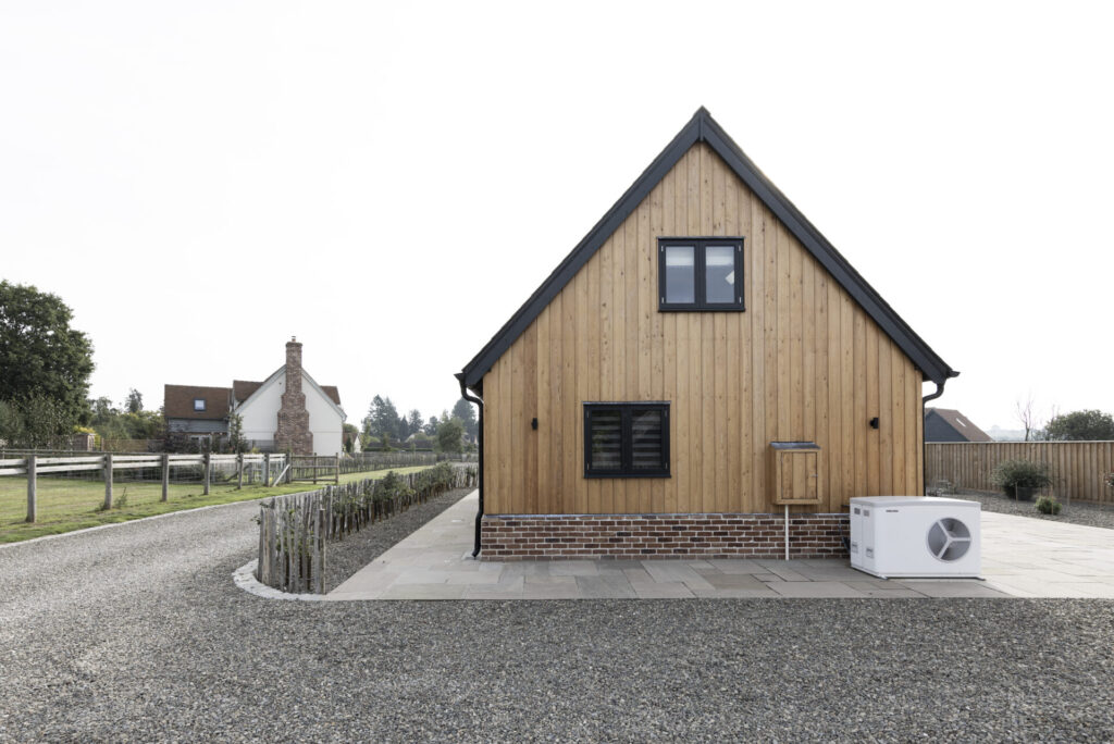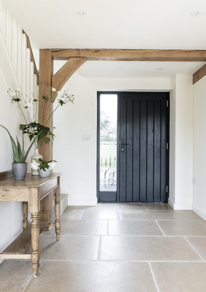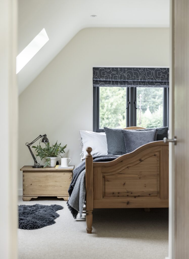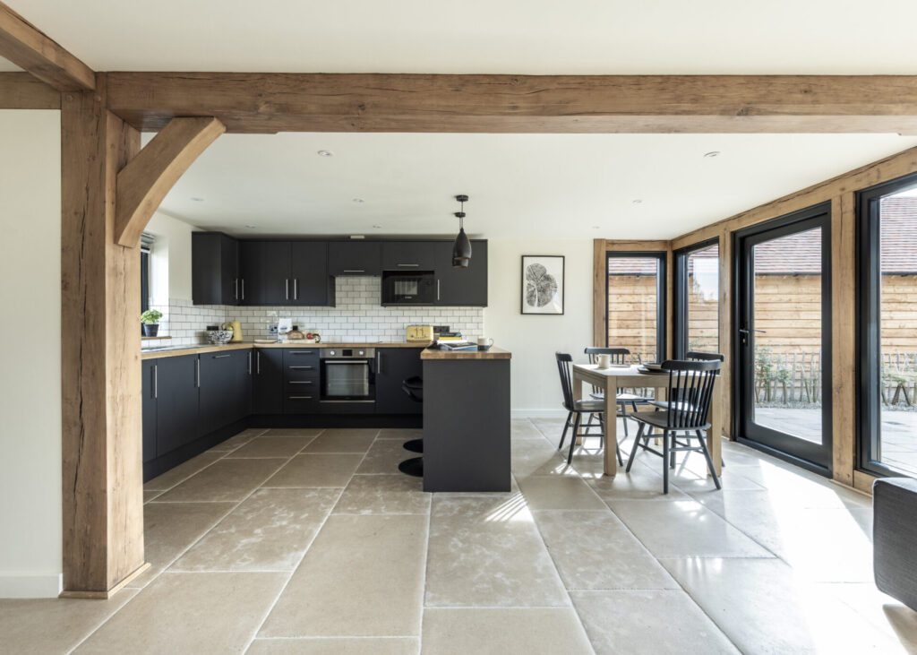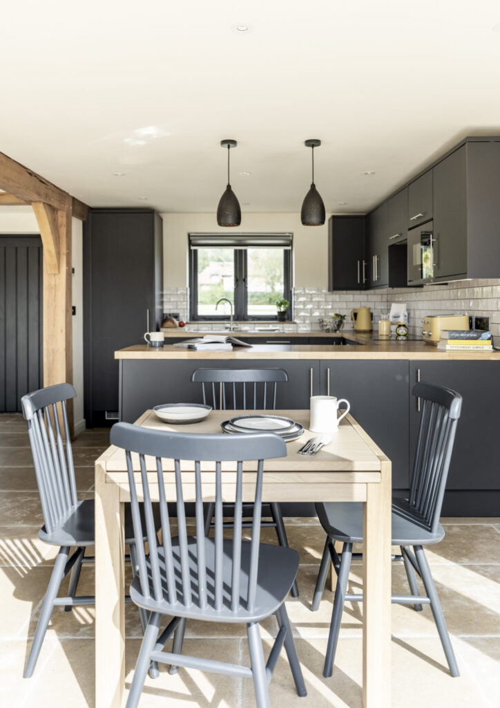 Border Oak designed the scheme and managed the planning application process on behalf of the landowner. Once detailed planning had been secured each plot was sold by Border Oak to customers wishing to build their own home, with each contract designed to reflect the purchasers preference – self build, custom build, or custom finish. The landowners retained a plot for their own home and another for their daughter Roxy. Roxy is a talented young builder and has built this beautiful and contemporary two bedroom Border Oak barn for herself.