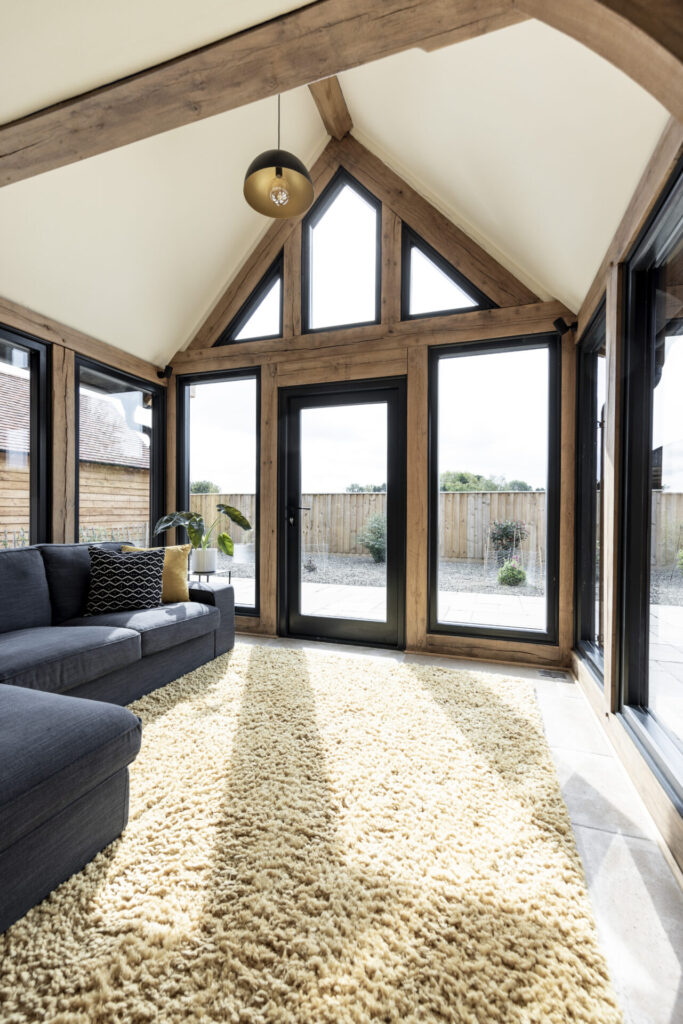 Border Oak provided Roxy with the superstructure (oak frame, roof structure and encapsulation panels) and then Roxy undertook the remaining building work herself, with help from others when needed.